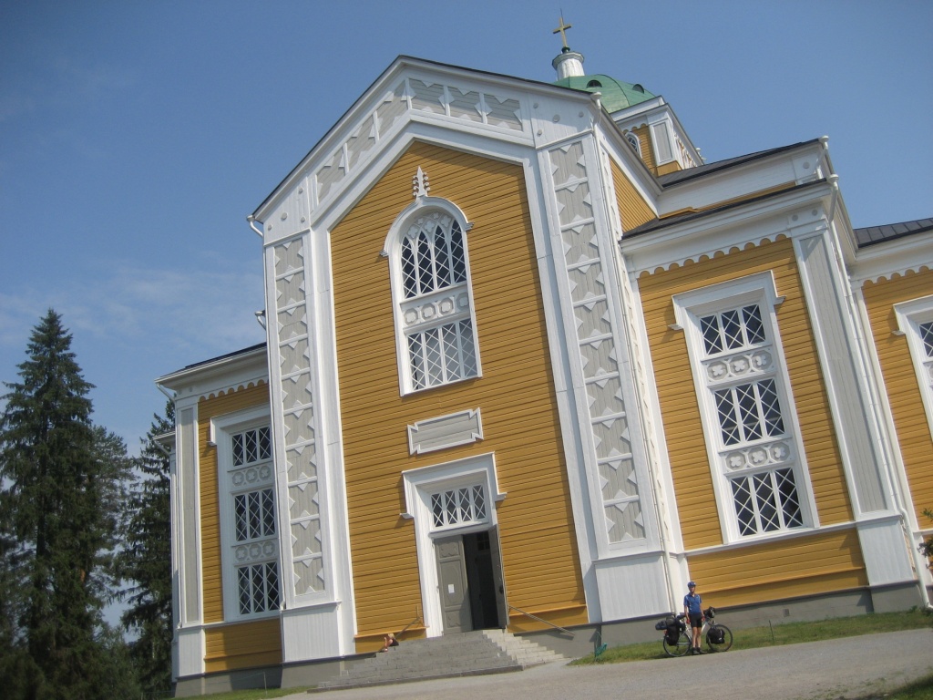 This morning I finally managed to leave heading east, but I cycled just an hour to reach the first stop. So many things to see in such a short range! So, the first stop was in Kerimäki, a small town which hosts the biggest wooden church in the world. You can get an idea looking at me in the picture. It may well look just a big church like many others, but think that it is completely made of wood, and it's already 140 years old. And apart from the many anecdotes about why such a big church for a town of a few thousand people, the reality is that it was made out of wood instead of bricks because at the time the parish couldn't afford it. Wood instead was instead widely available and reasonably cheap. I wonder whether nowadays things are reversed.